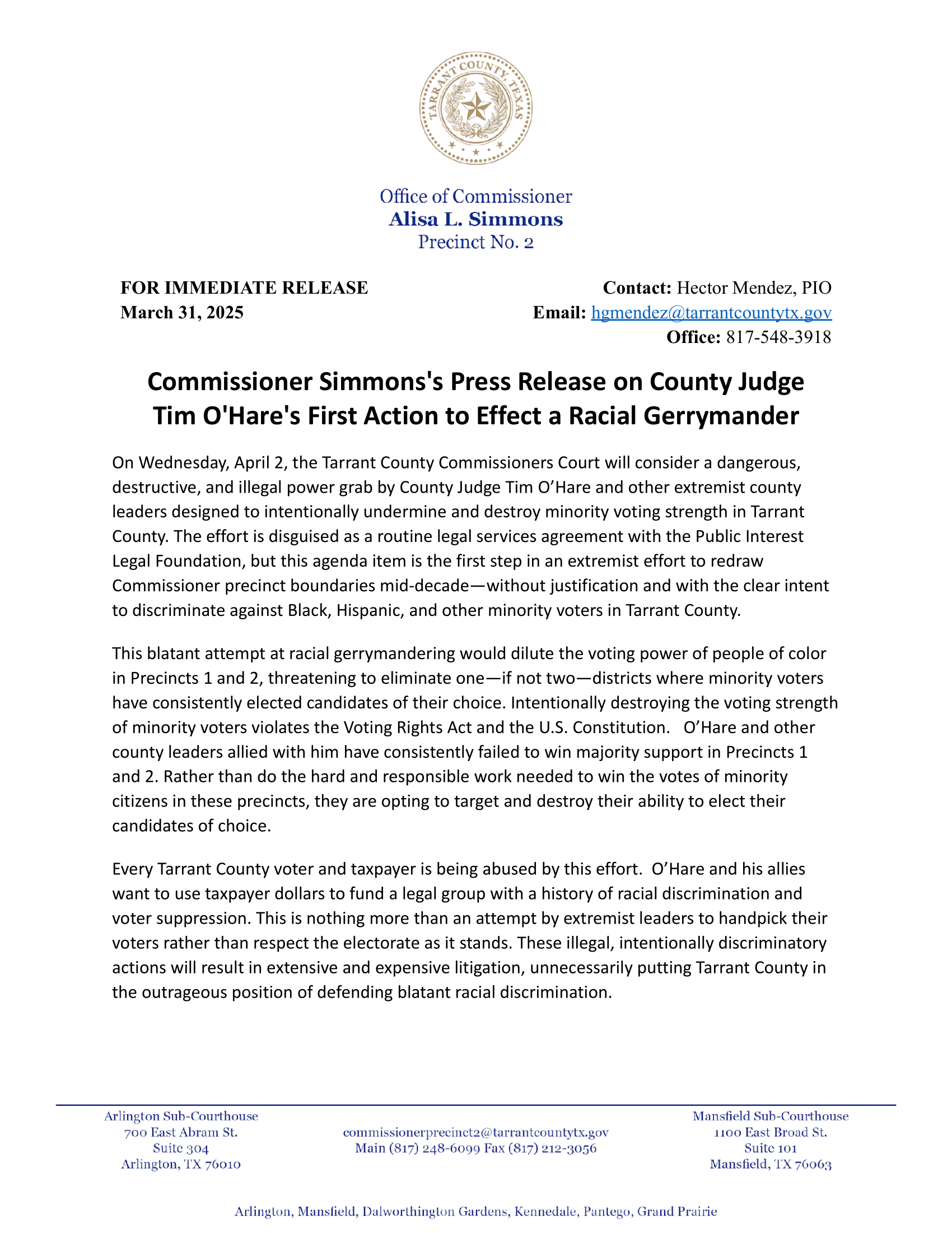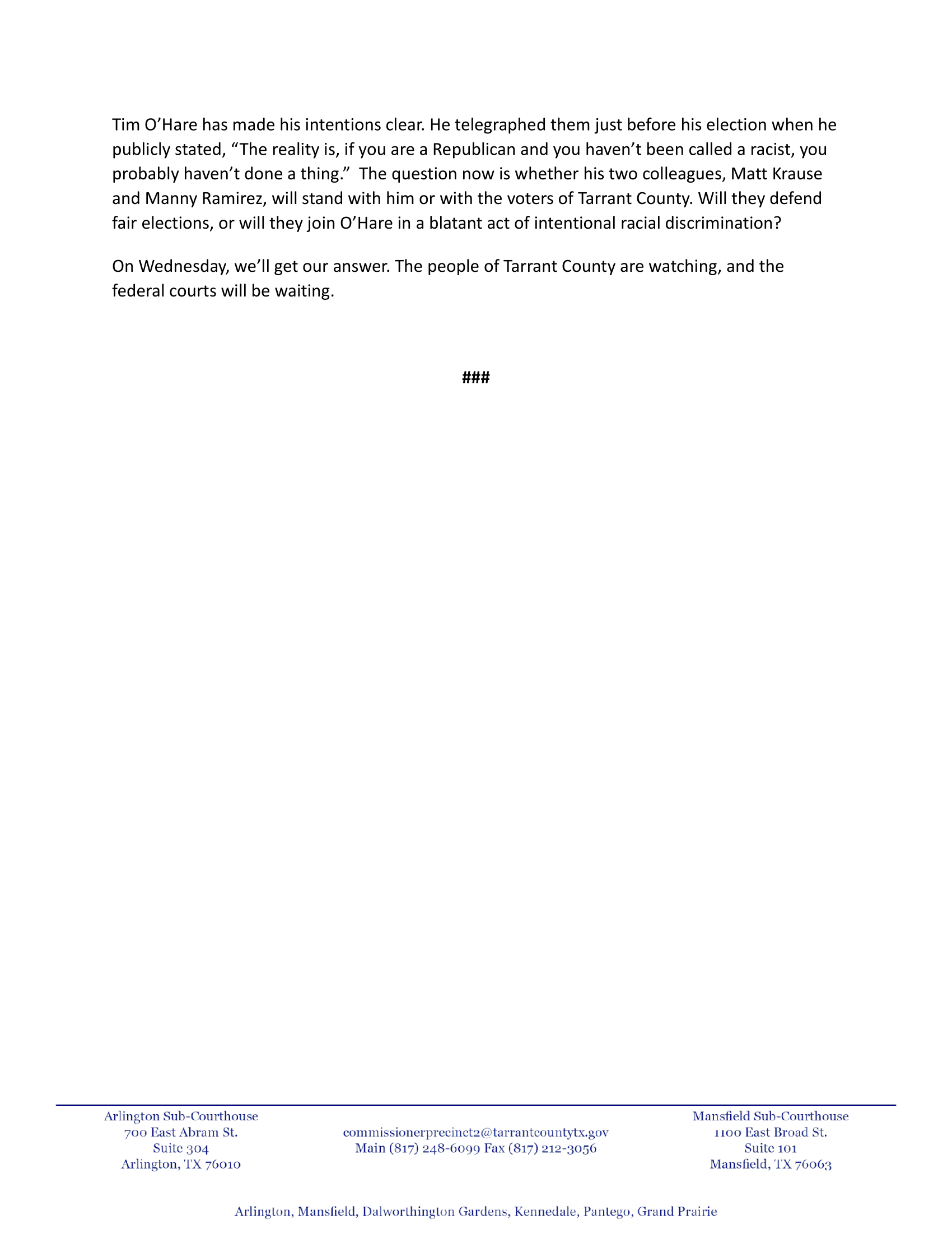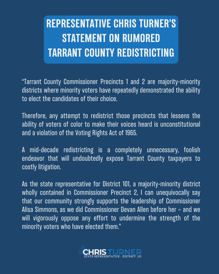 🚨🚨TARRANT COUNTY CTA: On Wednesday, Judge Tim O’Hare proposes having a conservative consultant redraw Commissioners’ Court precincts 1 and 2, the only majority-minority districts. This is a call to action for Wednesday, April 2, 10 am at the Tarrant County Commissioners Court. (Further details at the bottom of this article.)