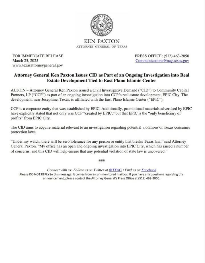 Attorney General Ken Paxton quickly followed, launching an investigation on “potential consumer protection violations.” He is focusing on EPIC as both the creator and “only beneficiary” of the project, as if a Muslim nonprofit benefiting its own faith community were somehow suspicious. This is something that is never questioned when Christian churches build private schools, senior homes, or housing projects.