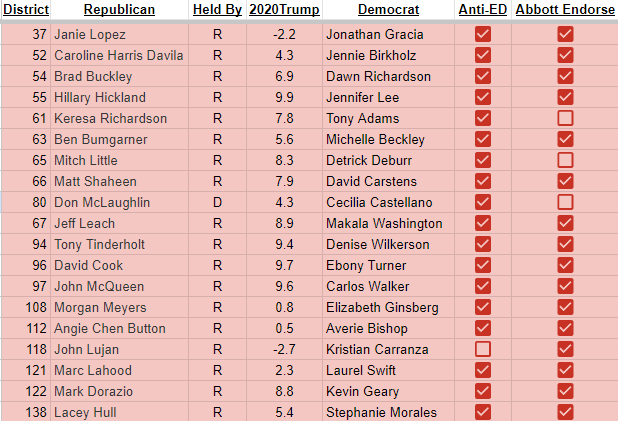 The only rural seat on this list has been held by a Democrat for many years (Tracy King—HD80), who retired, leaving it open. Otherwise, the focus is on urban and suburban counties. There could be an even bigger focus on urban since places like Collin and Williamson Counties are proliferating and will be urban counties in another decade. (But let’s not get ahead of ourselves.)