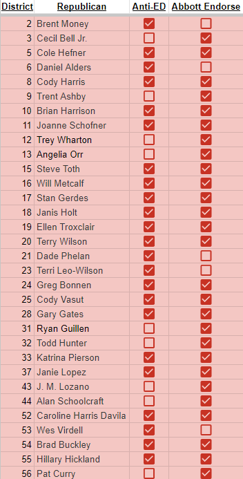Now that the primary runoffs are over, we have a good look at the Republicans who will be on the ballot in November. House Republicans would need 76 votes to pass vouchers in the 89th Legislature. I went through all the Republican seats (plus HD80) and compared them to the Texas Class Teacher Association ratings and Greg Abbott’s endorsements to determine how many votes there would be for vouchers.
