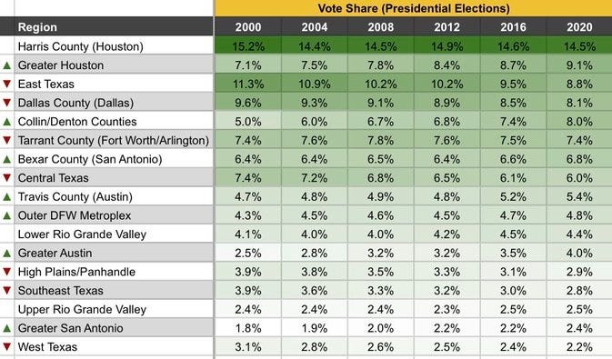 Each region is broken down by how much of the vote is determined by that region. For example, Houston contributed 14.5% of the total vote in 2020, whereas the Upper Rio Grande Valley contributed only 2.5%.