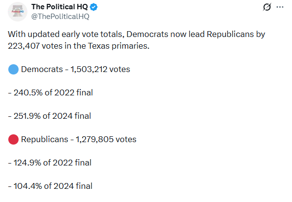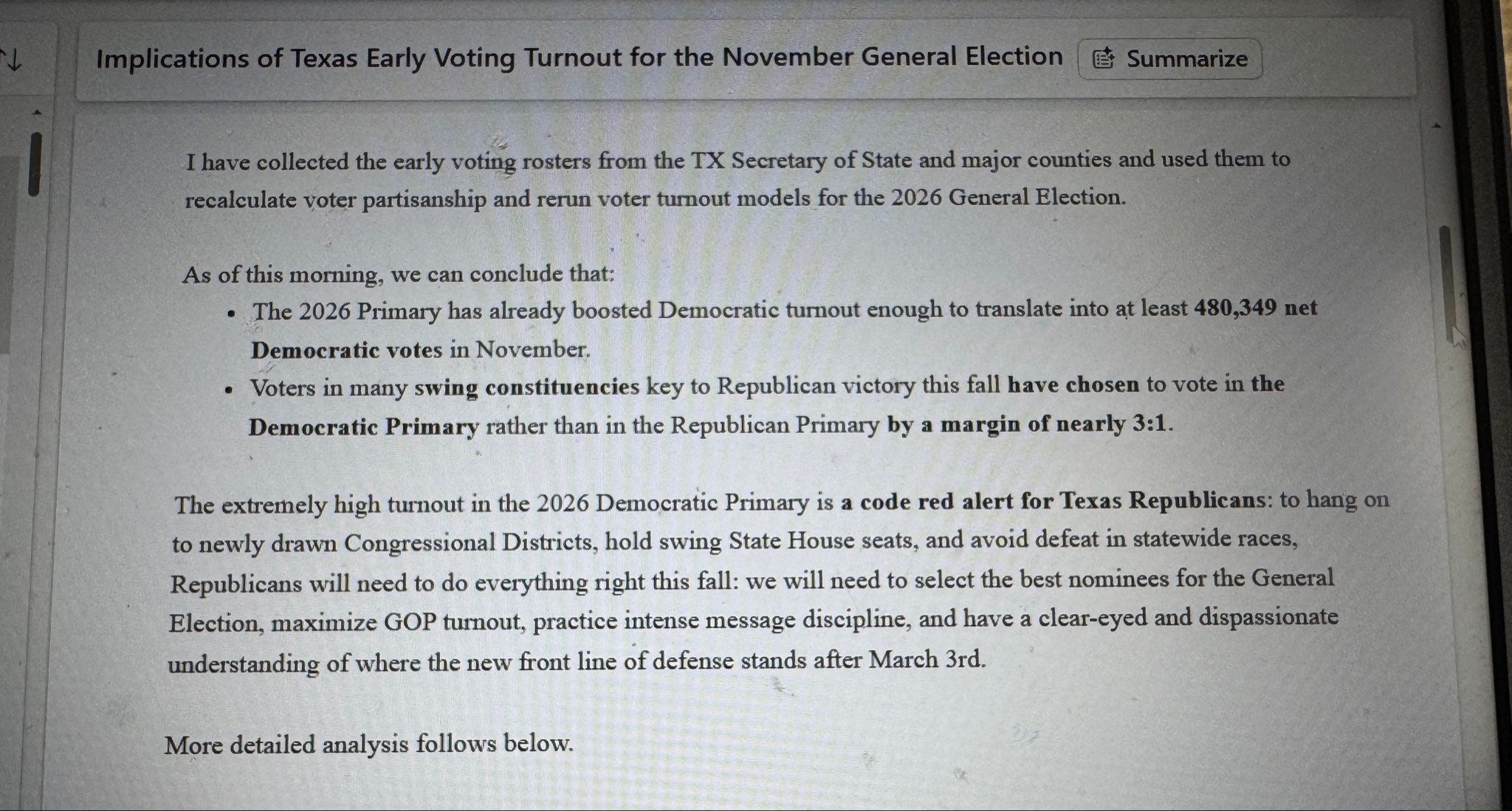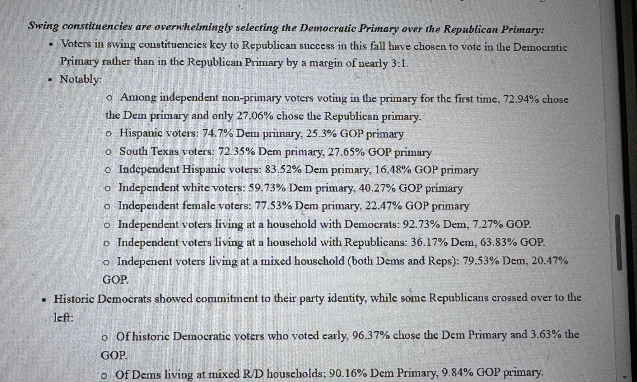 At the same time, the coalition itself is evolving in real time. Black voters remain a central pillar of the Democratic electorate. White suburban voters are re-entering the Democratic primary universe in larger numbers. Latino turnout is surging in some regions and lagging in others. And because this primary has drawn in so many new and irregular voters, the final margins in races like Crockett vs. Talarico will likely reflect not persuasion, but composition (who showed up, and in what proportion).
