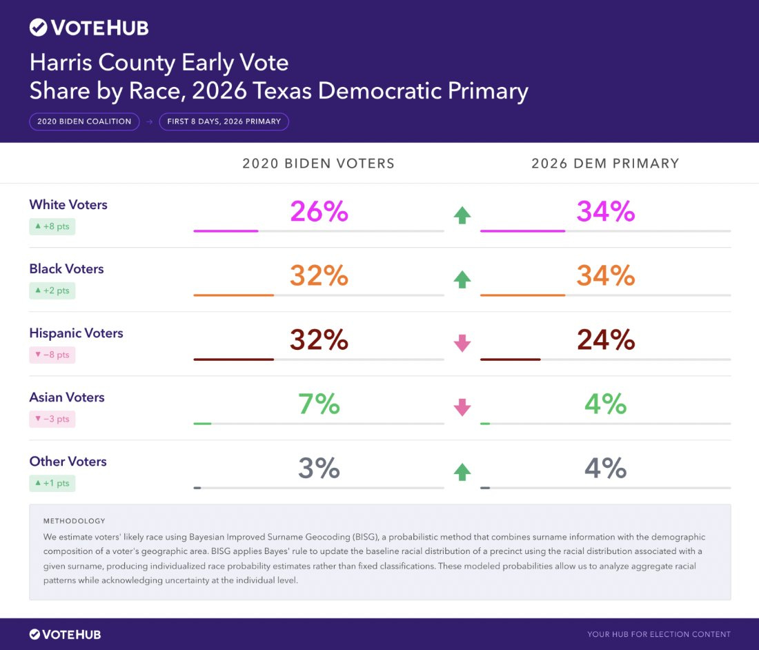 Harris County, compared to the “2020 Biden coalition,” the 2026 Dem primary early vote share shows white up (26% → 34%), Black slightly up (32% → 34%), Hispanics down (32% → 24%), Asians down (7% → 4%).