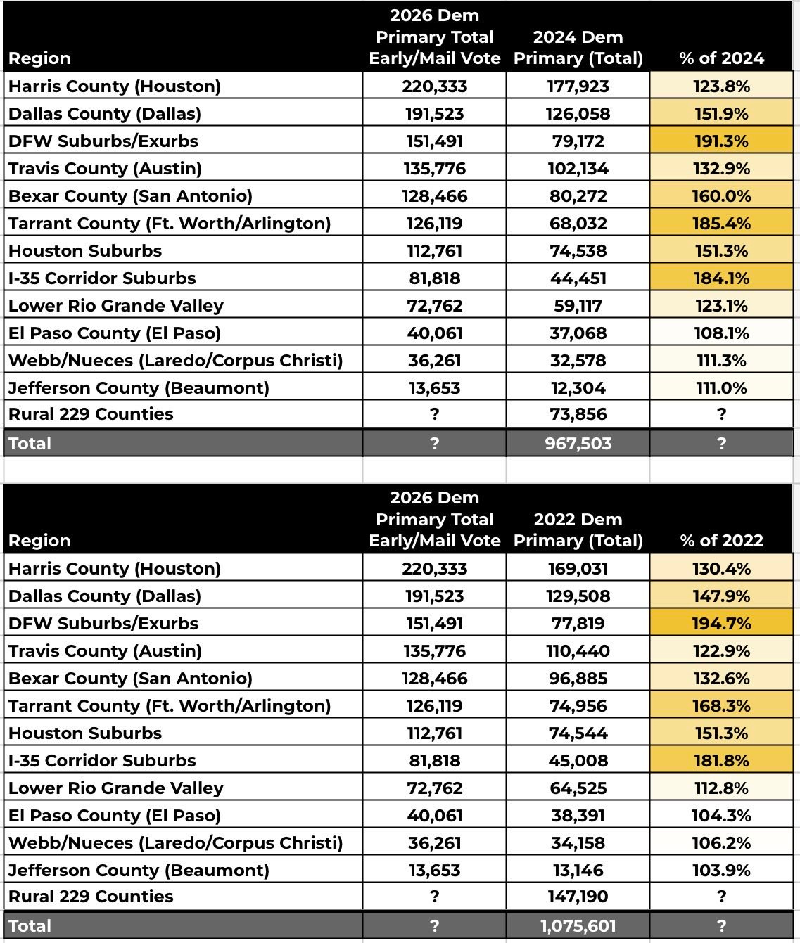The fast-growing DFW suburbs/exurbs (Collin, Denton, Ellis, Kaufman, Rockwall, Parker) are turning out in super high numbers. Already 90-95% higher than the entire 2022/2024 Dem primary electorates.