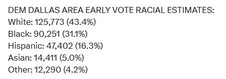 Crockett will need to win Harris County by at least +6 or +7 to win the Senate race. We’re expecting her to dominate the Black vote, keep enough consolidation elsewhere, and win by mobilization. And in places like Dallas County/DFW, that “Black share in the 30s” estimate is no small detail.