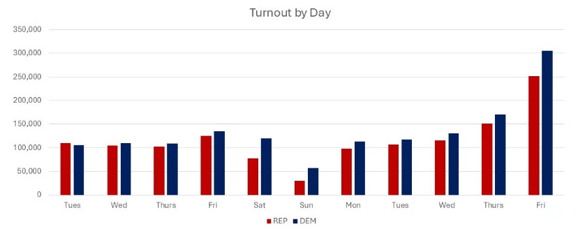 And of course, all of this is subject to change on election day when another million or two voters will hit the polls. And likely Wednesday and Thursday, we’ll be talking about more data, because then we’ll have the full picture. And that’s really the key point here. This isn’t one number. It isn’t one county. It isn’t one demographic group. It’s the entire electorate shifting, all at once.