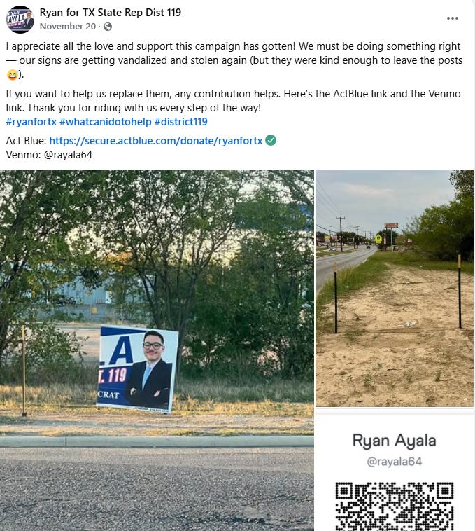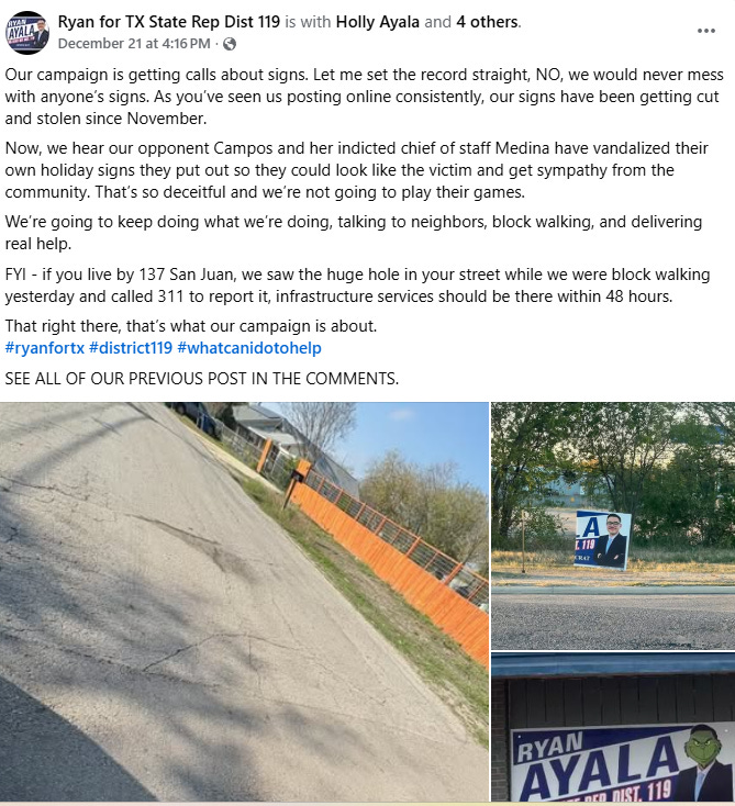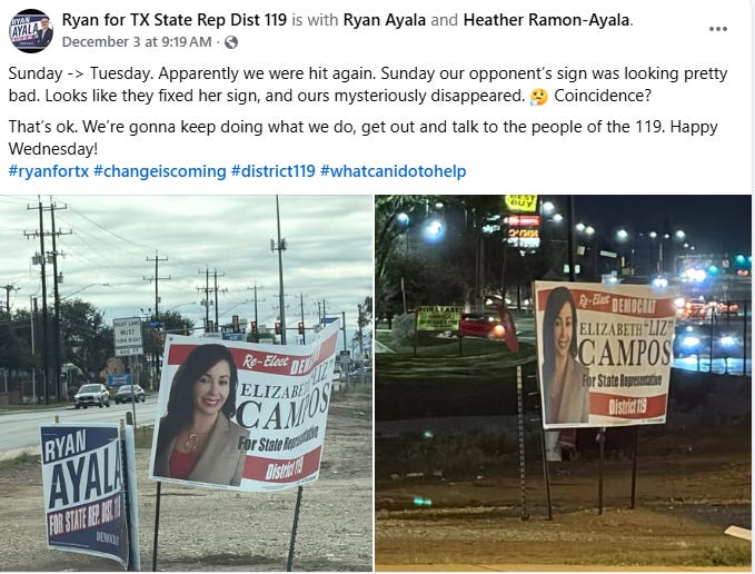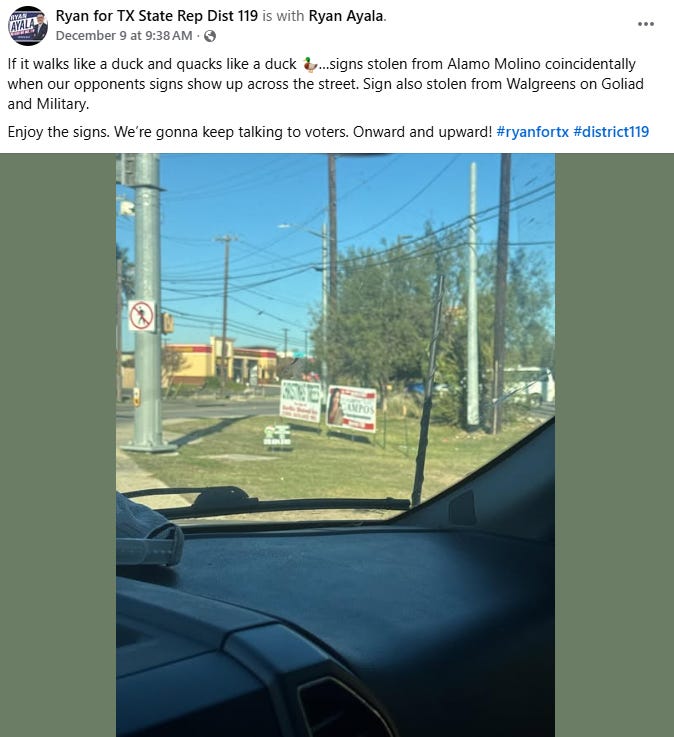 Now, behind the news reports, the Campos campaign was pointing fingers at the Ayala campaign, and the Ayala campaign was pointing fingers at the Campos campaign. Meanwhile, my sources on the ground in San Antonio have told me it might have been the actions of an inebriated unsheltered individual.