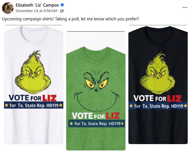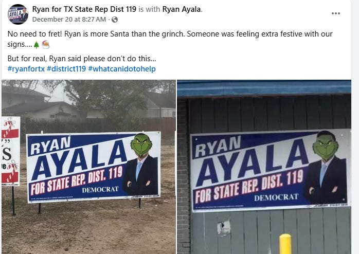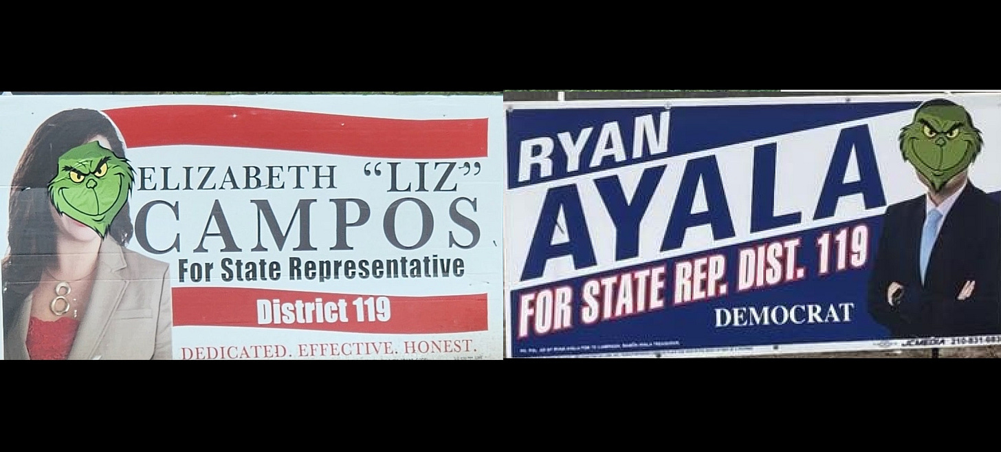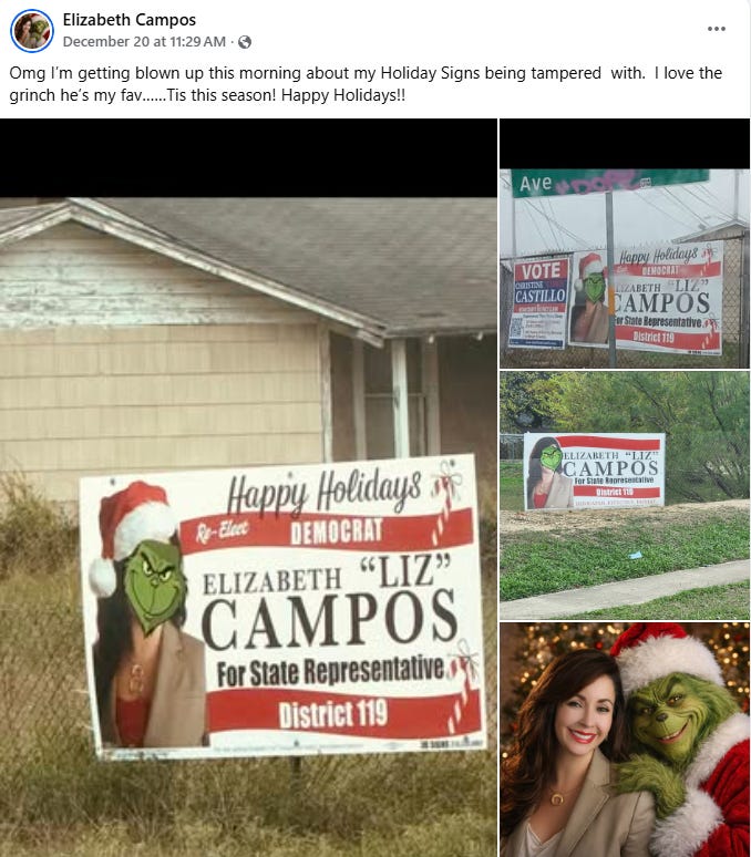 If you don’t live in San Antonio, you may have missed some of the local news about the HD119 Democratic primary candidates. On December 20, both Liz Campos (D-HD119) and her primary opponent, Ryan Ayala, had their signs vandalized with stickers of the Grinch over their faces.