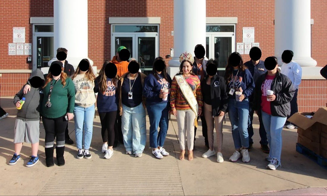 She was the only one wearing a crown. Come to find out, Campos is the Rey Feo Reina Linda, an honorary position that helps raise funds for a scholarship. And with this position, she gets a crown, a sash, and rides around in the back of cars at parades.