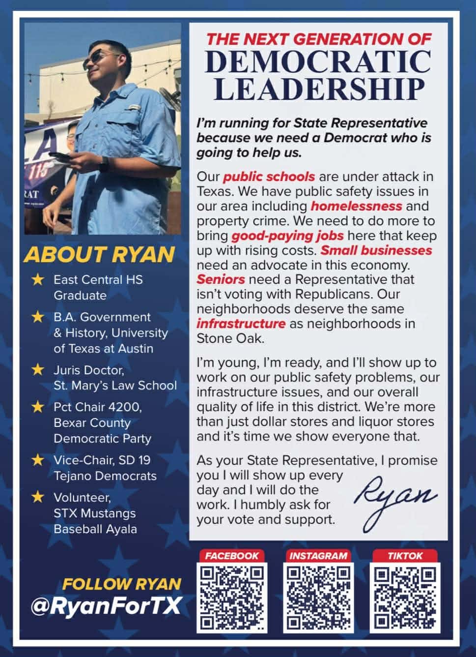 Ryan Ayala is running a serious grassroots campaign and has been on the ground, door-knocking and holding events for months. He doesn’t even have a website up yet, but has already garnered a ton of support in the community, including endorsements from previously serving Representatives and local Bexar County officials.